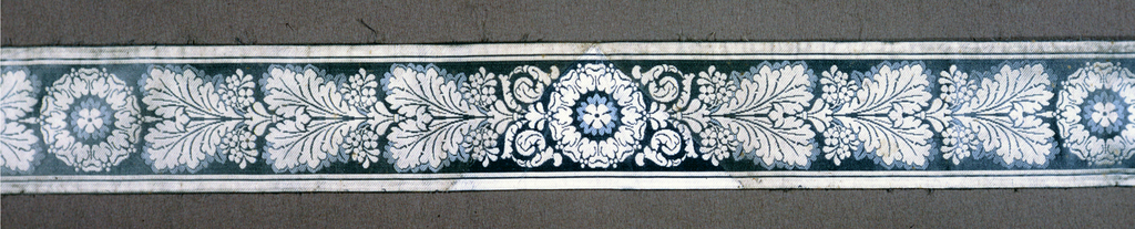 This is a Border. We acquired it in 1950. Its technique is ground: 7&1 satin. pattern: damasse. It is a part of the Textiles department.