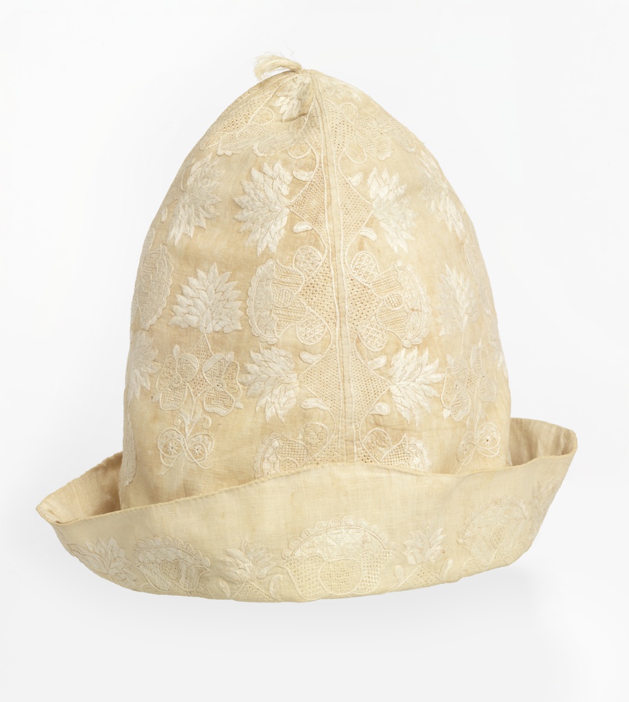 This is a Cap. It is dated 18th century and we acquired it in 1950. Its medium is linen foundation, cotton embroidery. It is a part of the Textiles department.