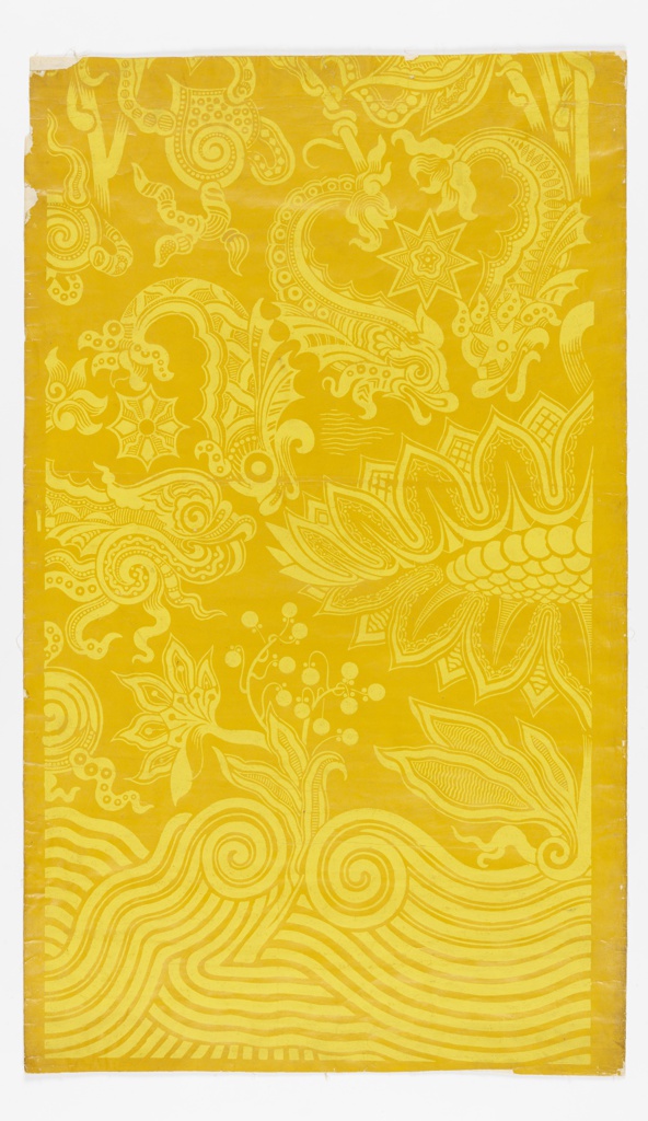 This is the lower portion of one panel of the Dragon wallpaper from the Royal Pavilion at Brighton, England, produced in 1820. The Royal Pavilion was a Chinese-inspired palace built for the Prince of Wales, later to become King George IV. This design was originally hand-painted directly onto the walls in the Drawing Room. The design appealed to the King and within a year of its being painted, he commissioned a company to carve wood blocks of the design so it could be reproduced as wallpaper, which was then hung in multiple rooms. This was a major undertaking as the repeat measured 3 x 2.5 m (10 x 8.5’). It required a 6 panel width and 30 large blocks to print.