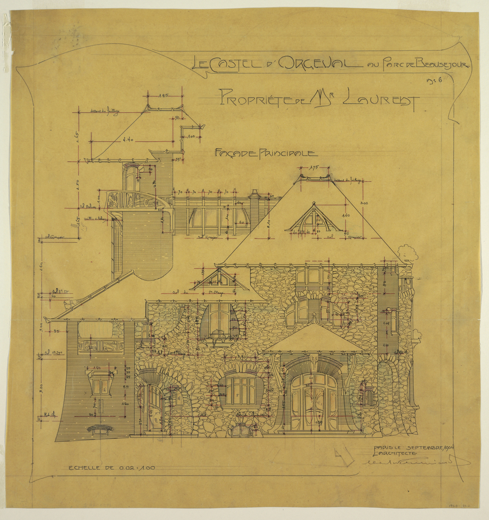 In black ink, upper margin: LE CASTEL D'ORGEVAL AU PARC DE BEAUSEJOUR / NO. 6/ PROPRI T DE MR LAURENT / FA ADE PRINCIPAL; lower right: Paris Le Septembre 1904 / L'ARCHITECTE / Hector Guimard; building notations throughout
