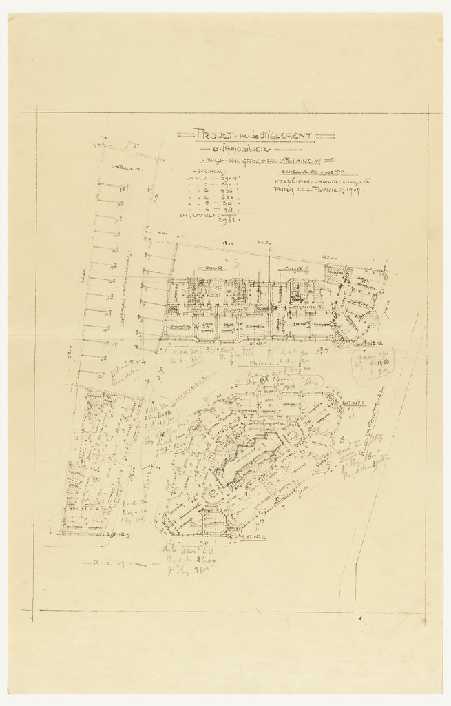 Print, Plan, Project de Lotillement, rue Gros and rue de la Fontaine, Paris; Designed by Hector Guimard ((French, 1867–1942)); France; photostat, graphite on buff wove paper; 65 x 44.8 cm (25 9/16 x 17 5/8 in.); Gift of Mme. Hector Guimard; 1950-66-8