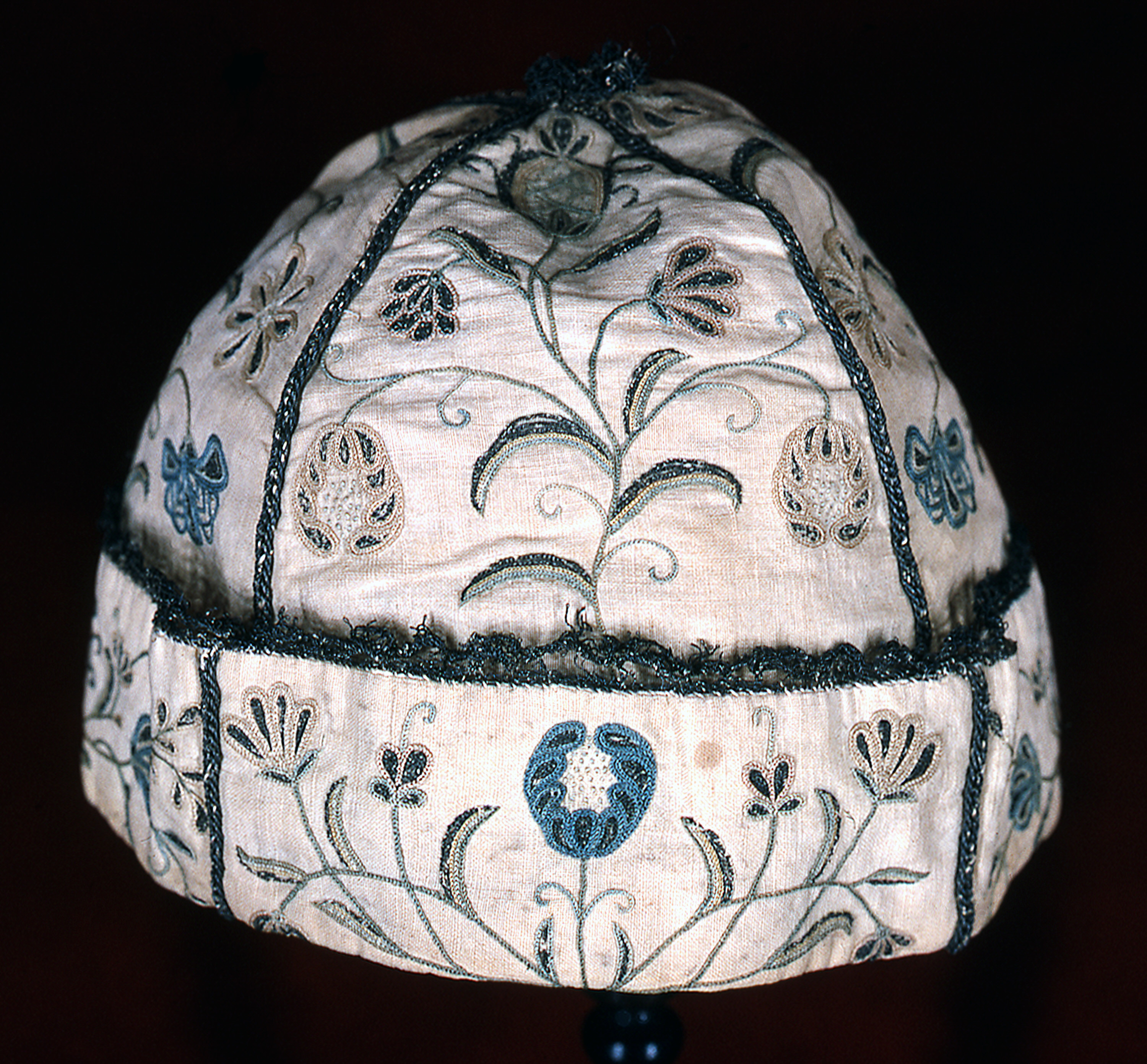 This is a Cap. It is dated 1700–1750 and we acquired it in 1951. Its medium is cotton, linen, silk, metallic and its technique is embroidery. It is a part of the Textiles department.