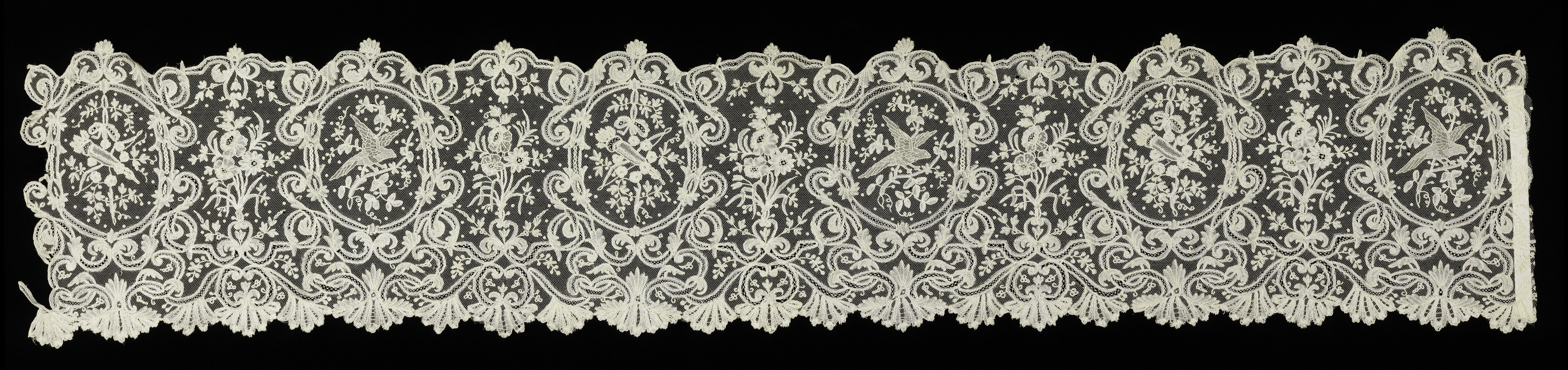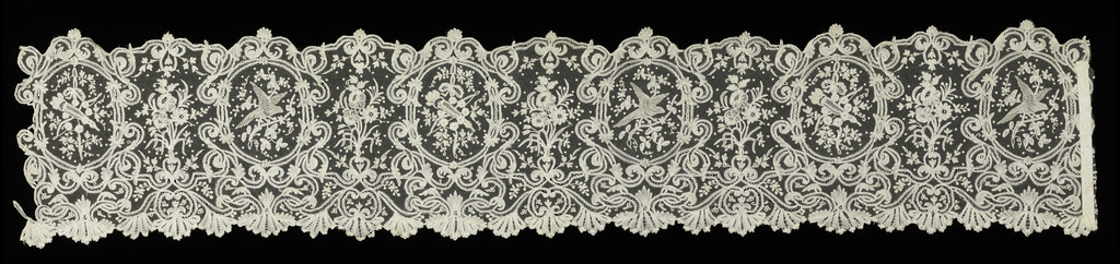 This is a Band. It is dated late 18th century and we acquired it in 1951. Its medium is linen and its technique is appliqué on net; bobbin lace. It is a part of the Textiles department.