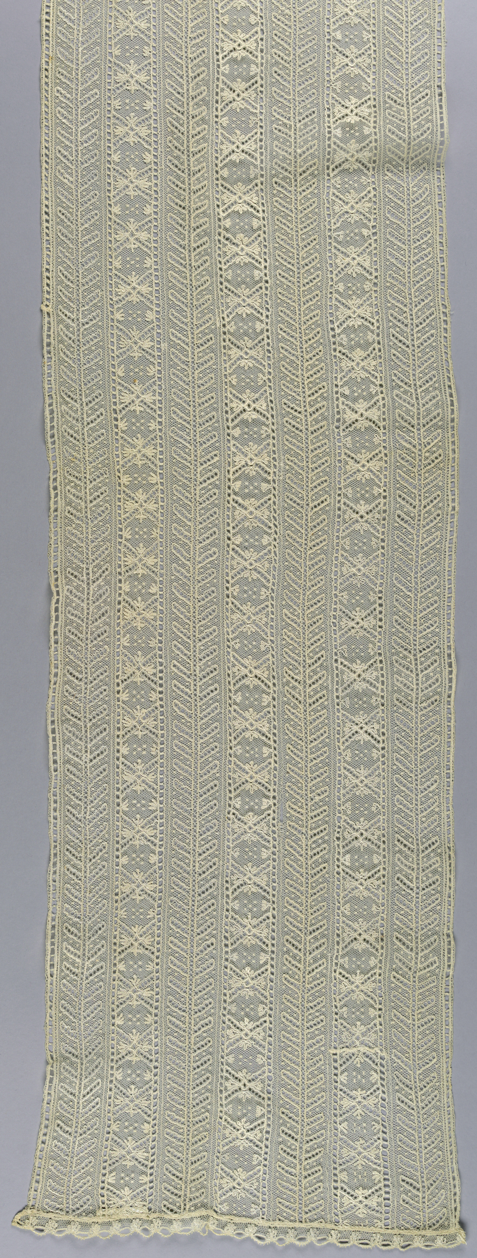 This is a Flounce. It is dated 19th century and we acquired it in 1951. Its medium is linen and its technique is bobbin lace made in lille style with heavy outlining thread. It is a part of the Textiles department.