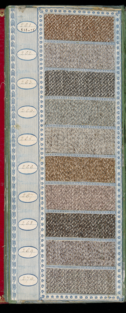 This is a Salesman's sample book. It is dated 19th century and we acquired it in 1951. Its medium is leather, paper, wool, cotton and its technique is plain and twill weave, some printed. It is a part of the Textiles department.