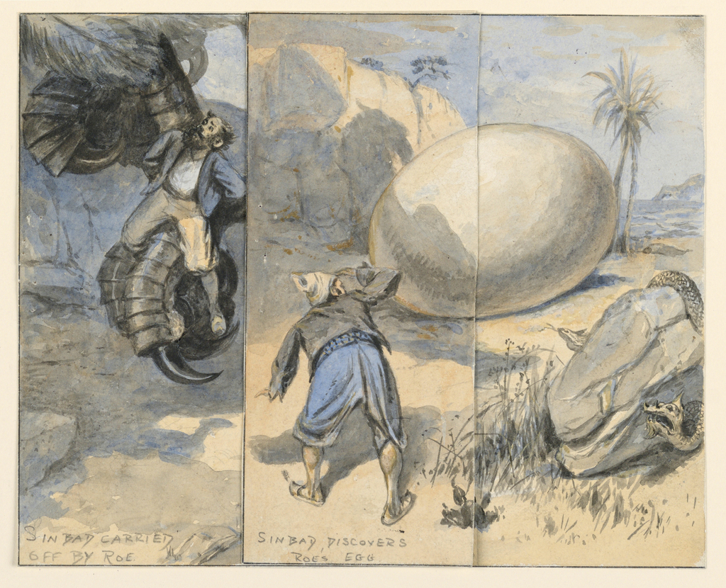 Drawing, Illustration for Sinbad the Sailor: Sinbad Discovers Roe's Egg (Roc's Egg); USA; brush and watercolor, graphite on paper; 19.1 × 7.9 cm (7 1/2 × 3 1/8 in.); Gift of Mrs. A. W. Erickson; 1951-171-8-b