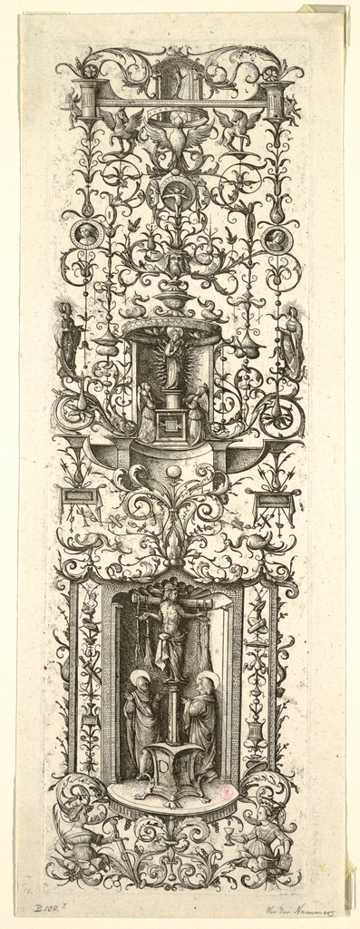 Print, Ornament with the Man of Sorrows, Mary and John; Designed by Daniel Hopfer (German, 1470 - 1536); Germany; etching on; 35.6 x 12.9 cm (14 in. x 5 1/16 in.); Gift of Mrs. A. W. Erickson; 1951-174-5