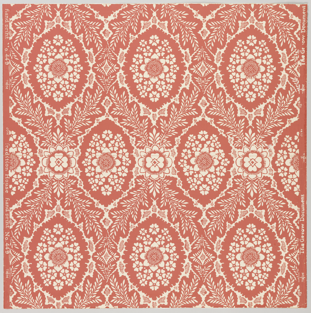 Sidewall, The Gerow Document; Manufactured by Tradition House; USA; screen printed on paper; 77 x 76 cm (30 5/16 x 29 15/16 in.); Gift of Interior Design and Decoration; 1951-27-2