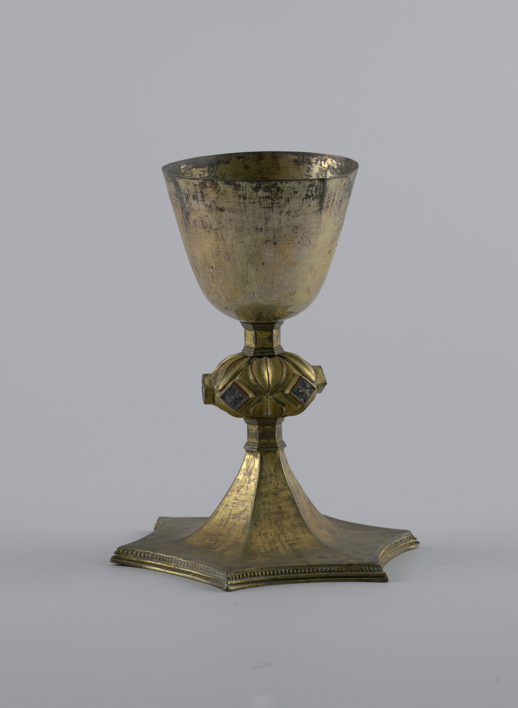 This is a Chalice. It is dated late 15th–16th century and we acquired it in 1951. Its medium is molded and gilt copper, engraved pewter. It is a part of the Product Design and Decorative Arts department.