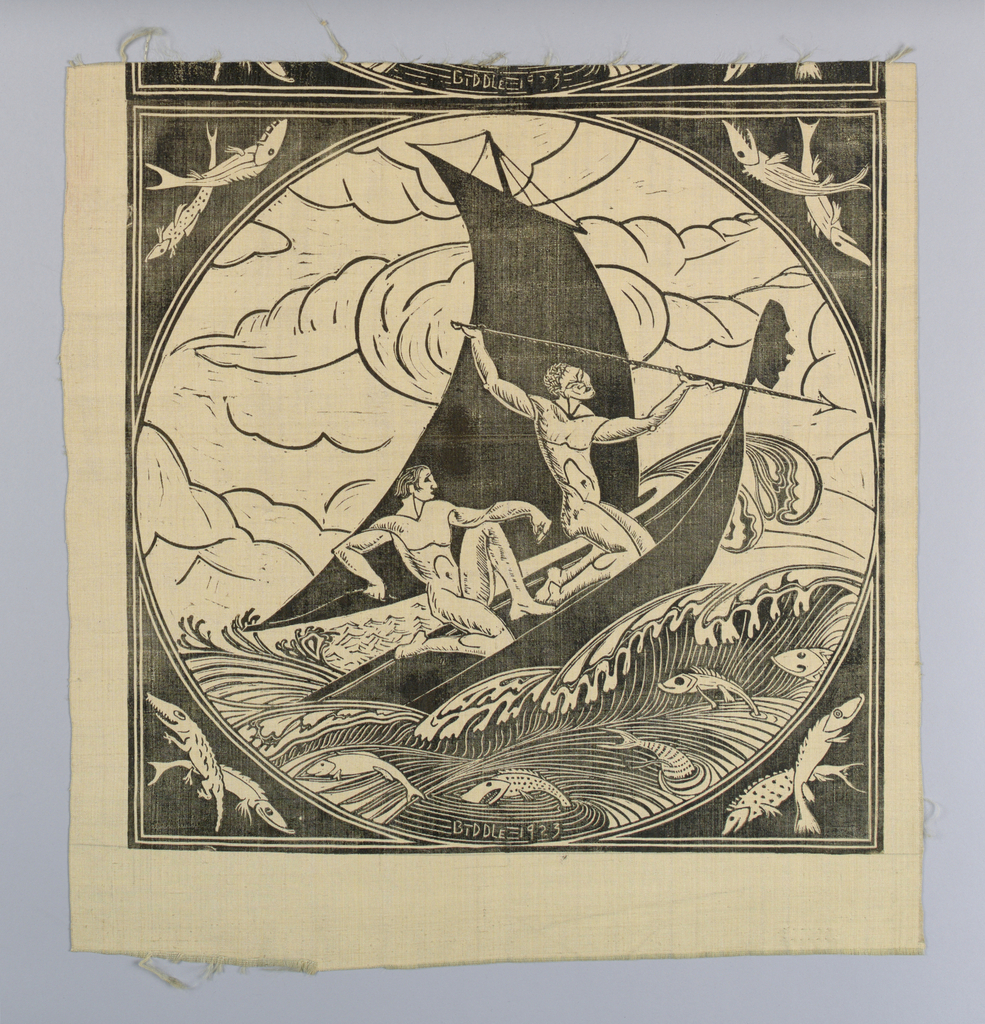 George Biddle (American, 1885–1973) was a prolific American artist who traveled widely to study drawing, print making, sculpting and painting early in his career. In 1919, after military service and a failed marriage, Biddle left for Tahiti to study print making, focusing on linocuts and woodcuts. This hand block print was made after Biddle returned to the United States in 1922 and shows two stylized male figures in a Polynesian-type boat. A schoolmate of Franklin D. Roosevelt at Groton School, Biddle also was instrumental in convincing the President to establish the Federal Art Project of the Works Progress Administration in the 1930s.