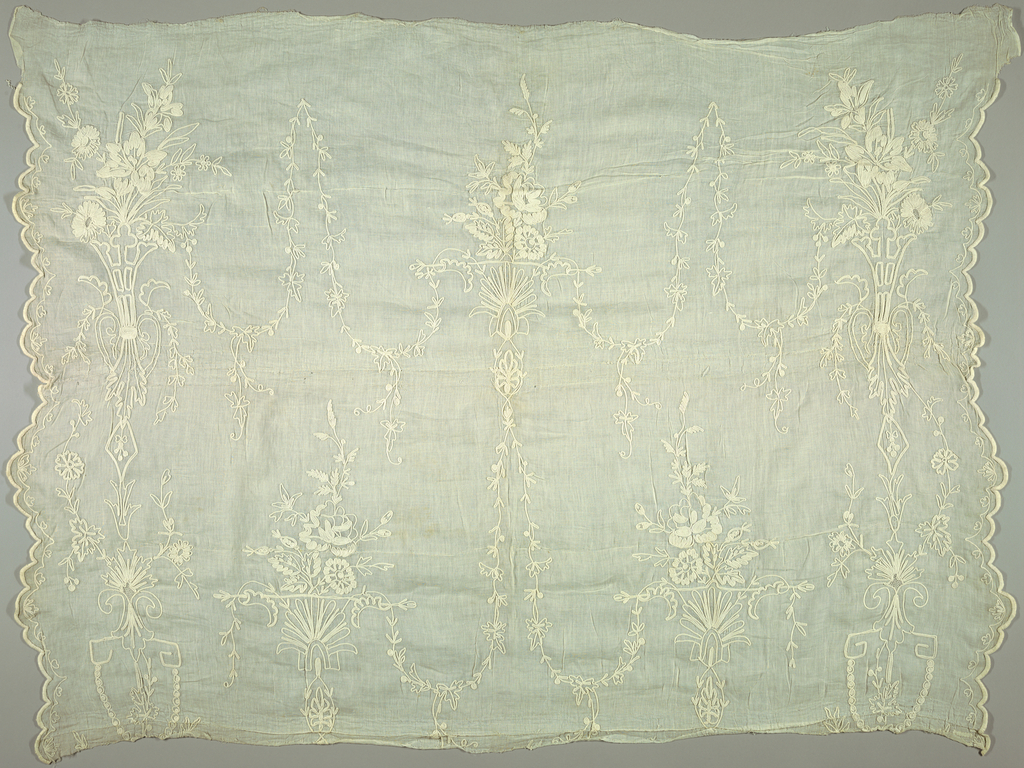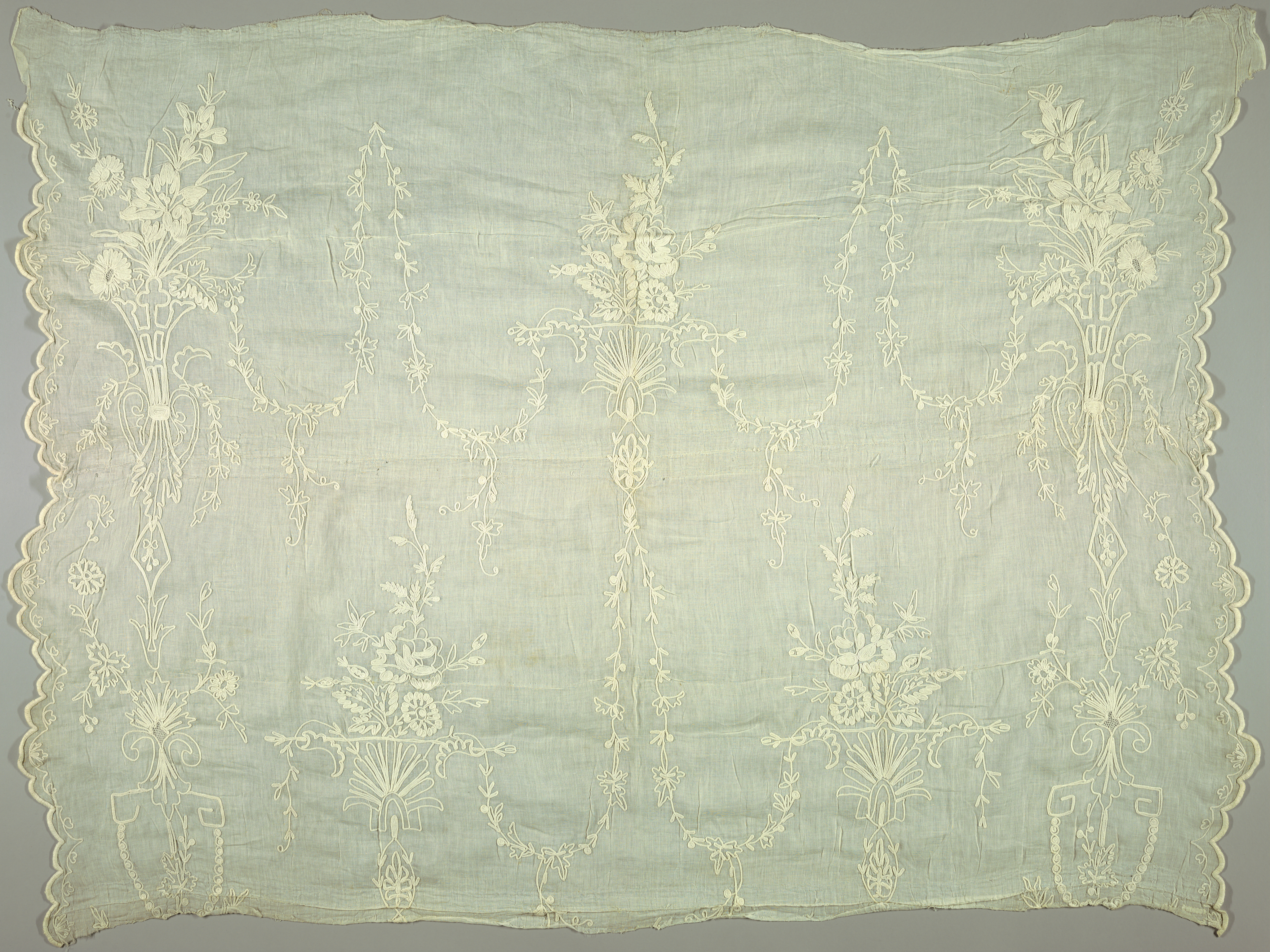 This is a Curtain panel. It is dated 1800–1850 and we acquired it in 1952. Its medium is cotton and its technique is embroidered. It is a part of the Textiles department.
