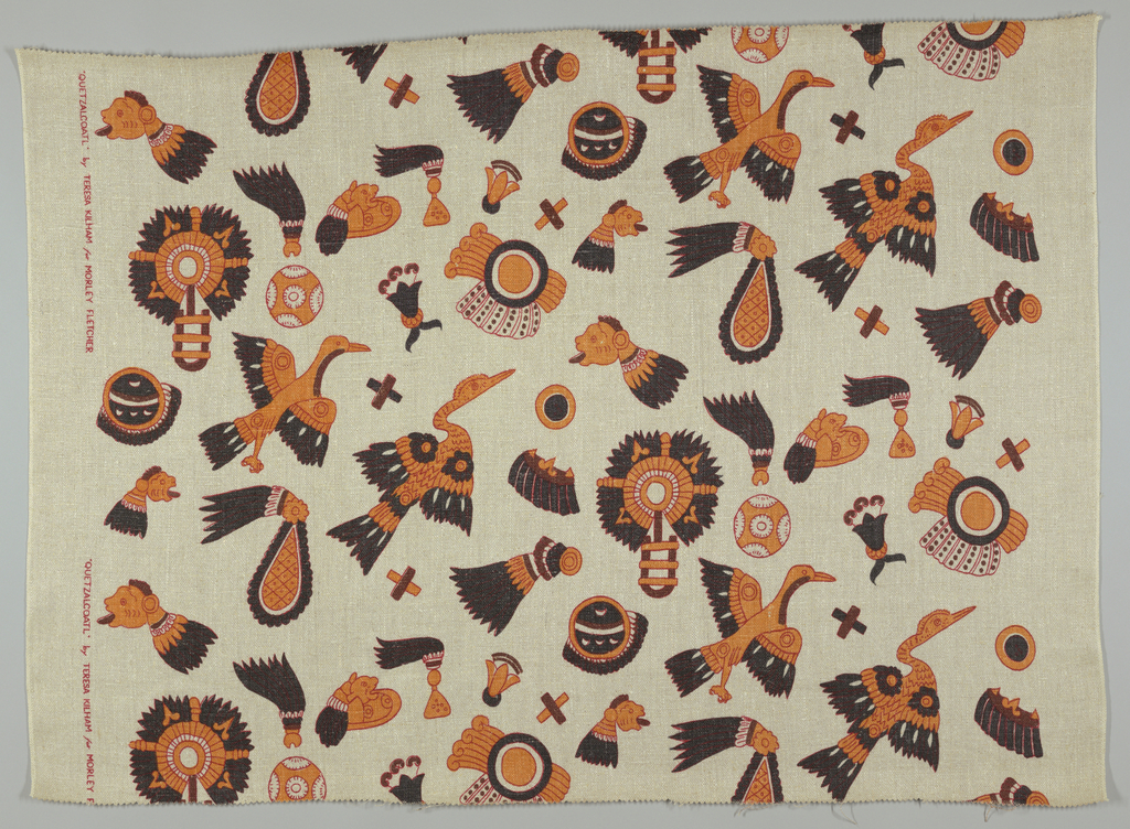 This is a Textile. It was designed by Teresa Kilham. We acquired it in 1952. Its medium is unbleached linen and its technique is silk screen. It is a part of the Textiles department.