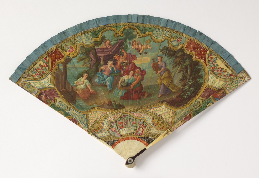 This brisé fan (one consisting of rigid sticks joined with a ribbon) illustrates a story from ancient Greek mythology. Dionysus, the god of wine, finds Ariadne on the Island of Naxos. Ariadne, the daughter of King Minos of Crete, has fled away with Theseus, slayer of the Minotaur, and been deserted by him on the island. Here she is discovered by Dionysus, who woos and marries her. Bacchanalian revelry and romance were popular subjects in the 18th-century. Here, the classical story is presented above an equally lighthearted chinoiserie scene. Both the ancient world and the Far East were rich sources of decorative imagery.