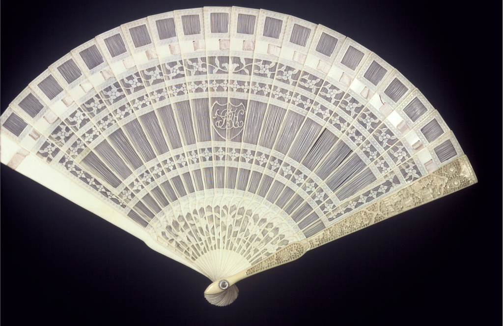 This is a Brisé fan. It is dated late 18th–19th century and we acquired it in 1952. Its medium is pierced and carved ivory sticks, silk ribbon. It is a part of the Textiles department.
