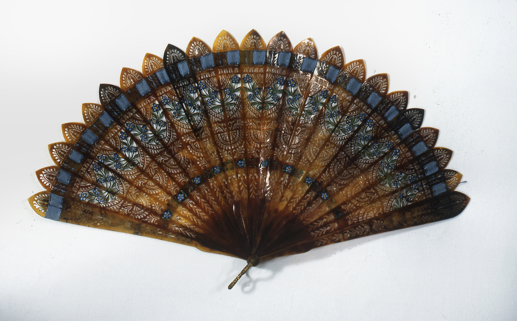 This is a Brisé fan. It is dated early 19th–early 20th century and we acquired it in 1952. Its medium is tortoise shell sticks pierced and painted with gouache, silk ribbon. It is a part of the Textiles department.