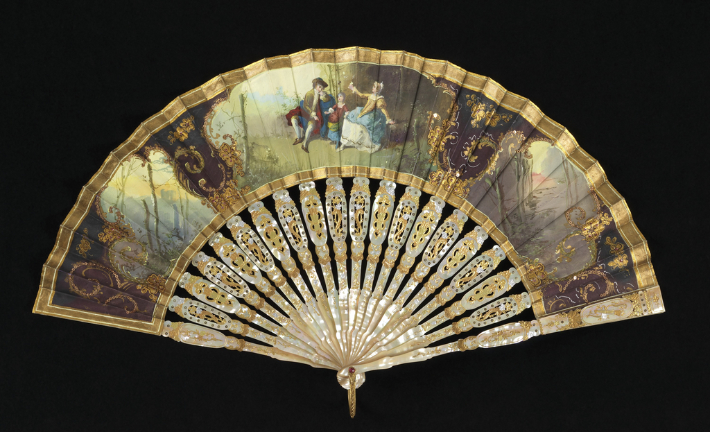 This is a Pleated fan and case. It is dated ca. 1887 and we acquired it in 1952. Its medium is silk leaf gilded and painted with gouache, embroidered with sequins, carved, pierced and painted mother-of-pearl sticks. It is a part of the Textiles department.