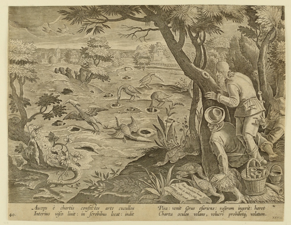 On rock, near lower right: Ioan. Stradanus invent. / Carol de Mallery Sculp. / Phls. Galle excud.; Below: AUCEPS E CHARTIS COMFECTOS ARTE CUCULLOS...; Lower left: 40; Lower right: XXVIII