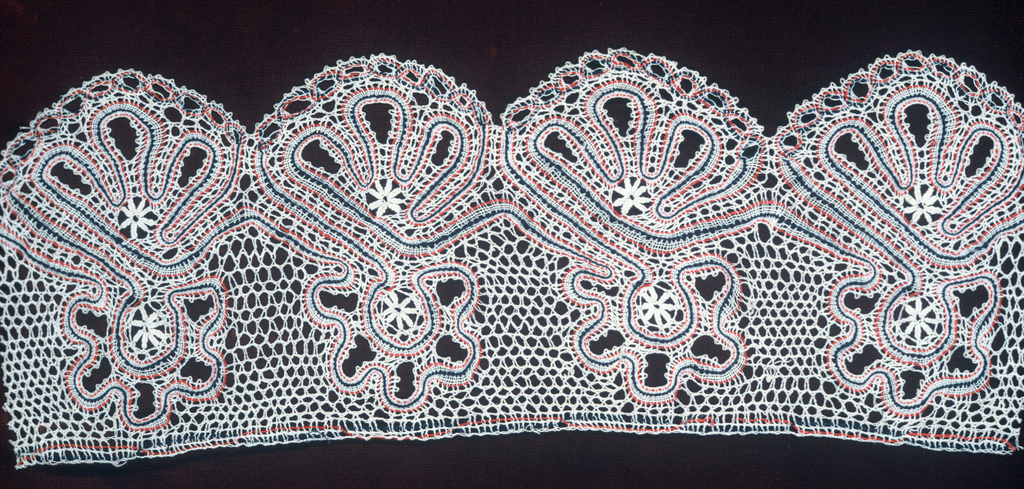 This is a Fragment. It is dated 19th–20th century and we acquired it in 1952. Its medium is cotton, wool (cat card 1966) and its technique is bobbin lace, eastern european, peasant style. It is a part of the Textiles department.