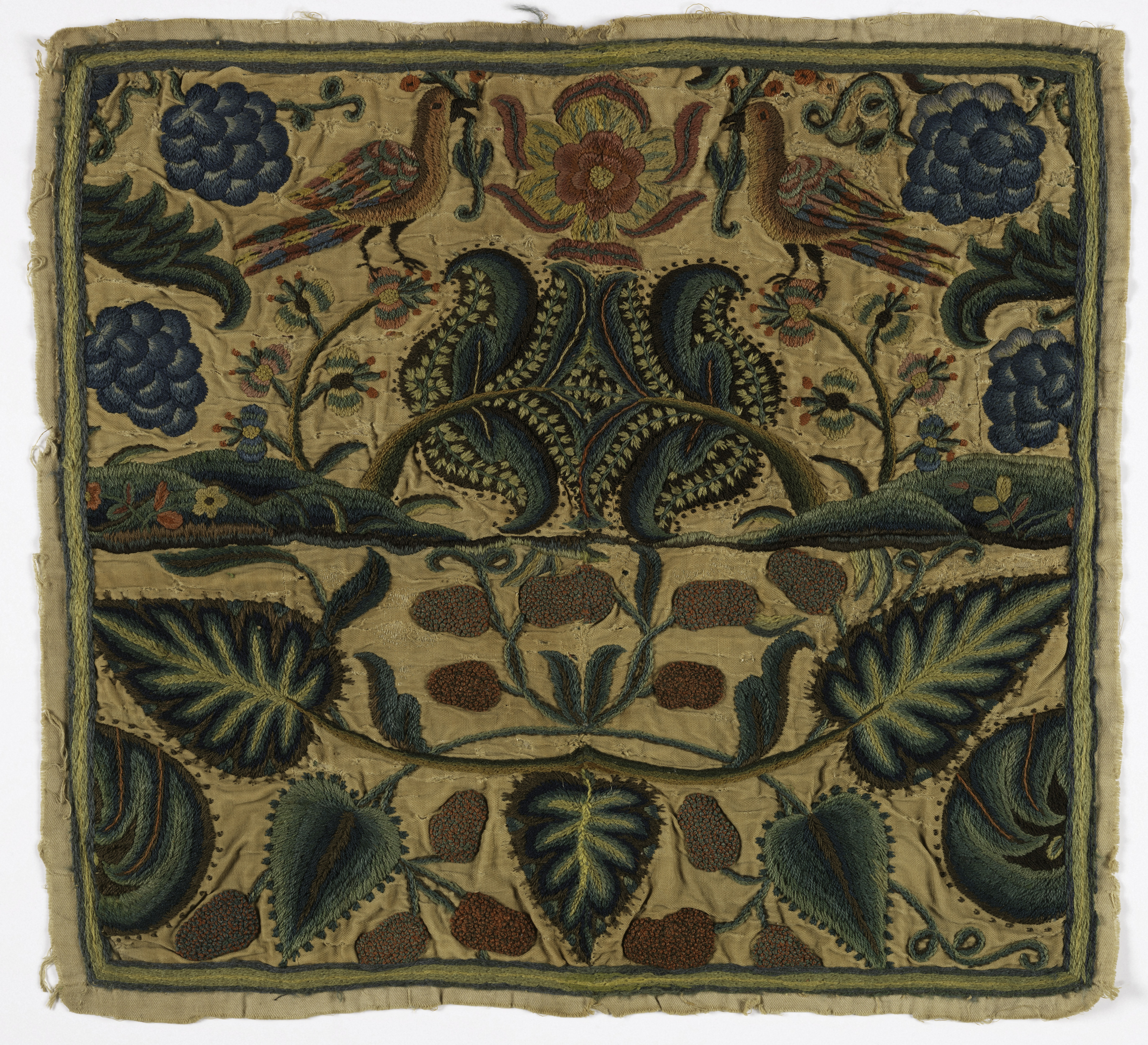 This is a panel. It is dated 17th century and we acquired it in 1952. Its medium is cotton, wool and its technique is crewel embroidery in satin, stem, knotting and other stitches. It is a part of the Textiles department.