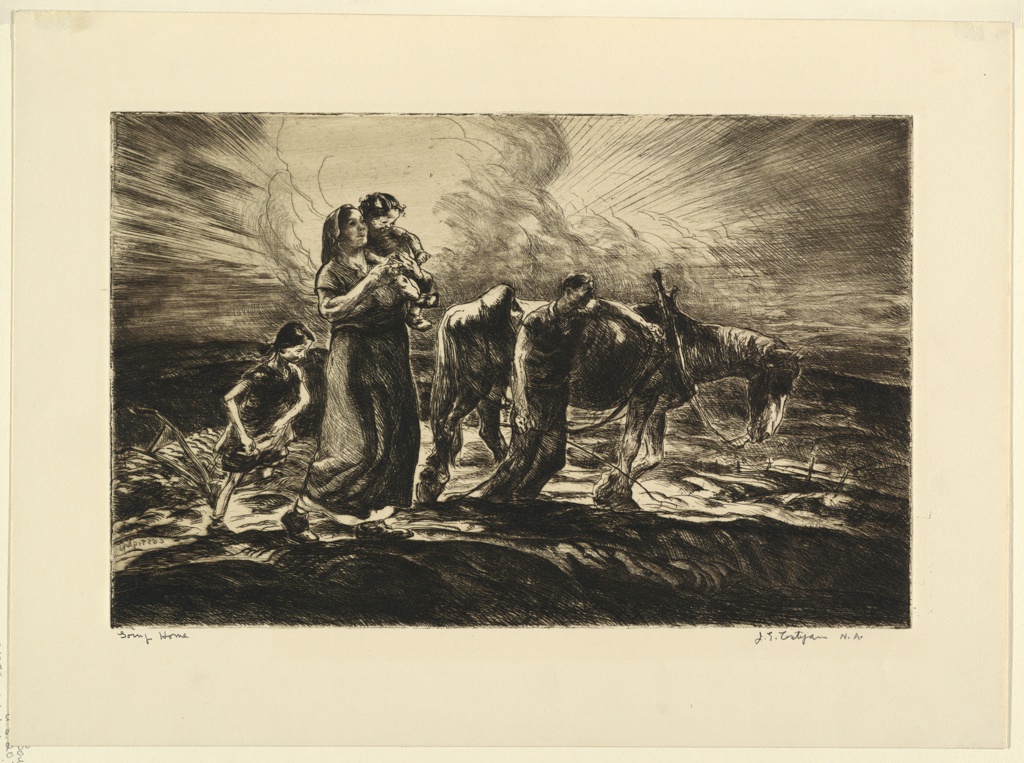 Print, Going Home; John E. Costigan (American, 1888–1972); Published by Associated American Artists (United States); USA; etching in sepia ink on cream wove paper; Platemark: 22.8 × 34.9 cm (9 × 13 3/4 in.) 33 × 43.8 cm (13 × 17 1/4 in.); Gift of William J. Donald; 1953-102-22