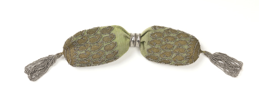This is a Miser's purse. It is dated 1840–70 and we acquired it in 1953. Its medium is silk, metal-wrapped silk core threads, metal beads and rings and its technique is crochet. It is a part of the Textiles department.