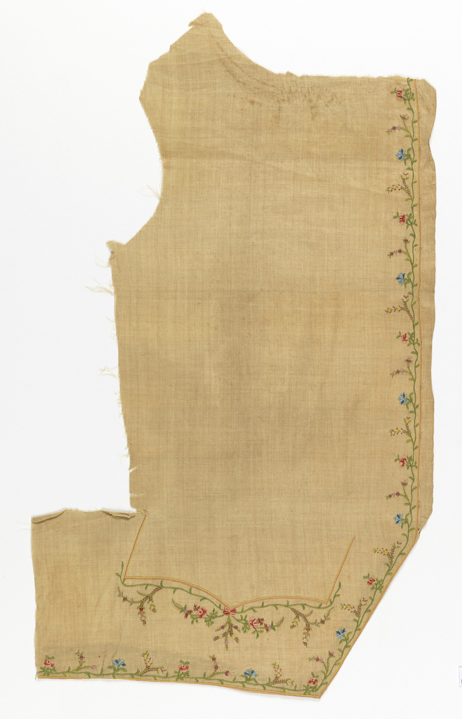 This is a Waistcoat, uncut. It is dated ca. 1750–1800 and we acquired it in 1953. Its medium is linen, silk and its technique is embroidery (chain stitch). It is a part of the Textiles department.