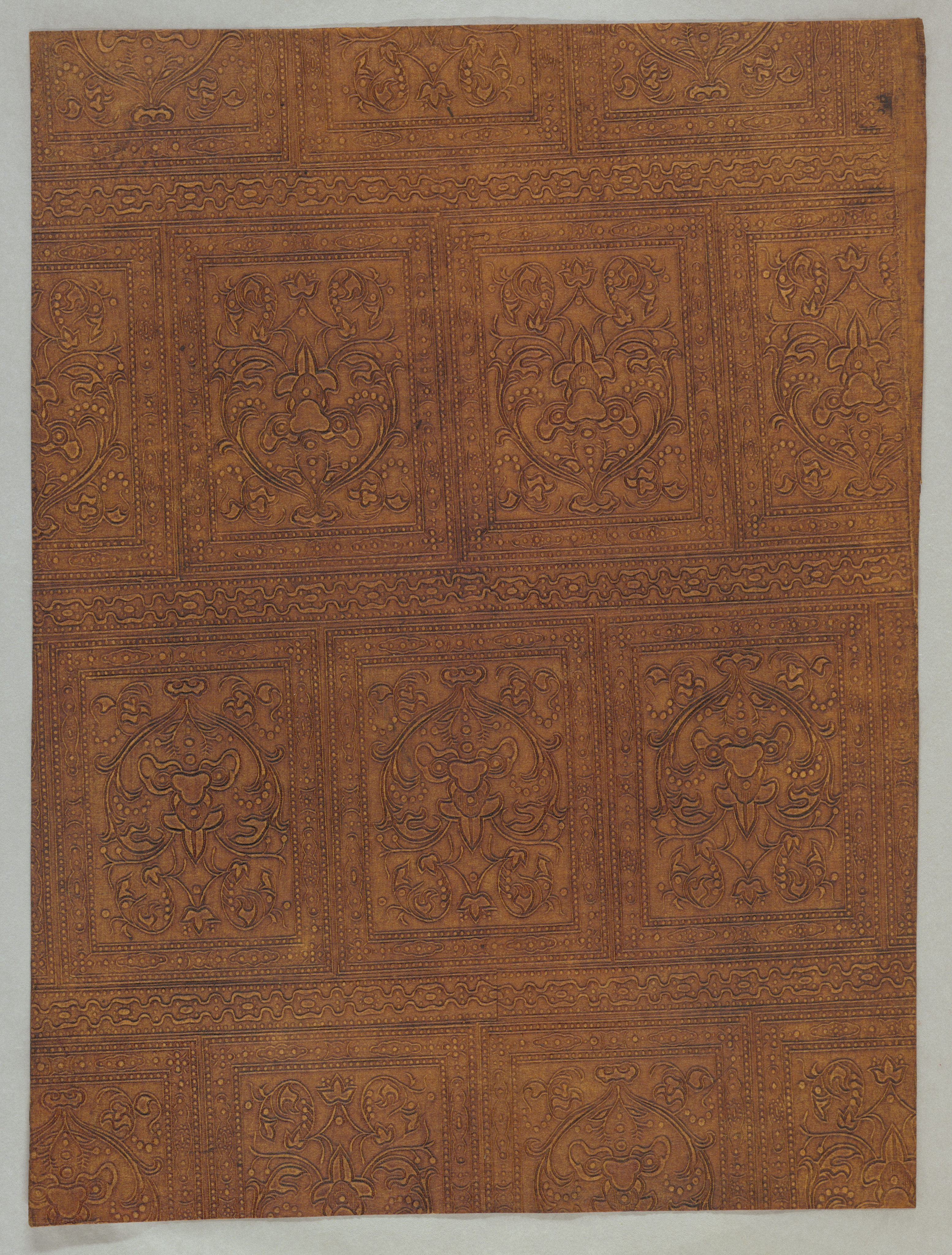 This is a Sidewall. It is dated ca. 1885 and we acquired it in 1953. Its medium is fiber composition impregnated with tung oil, embossed. It is a part of the Wallcoverings department.