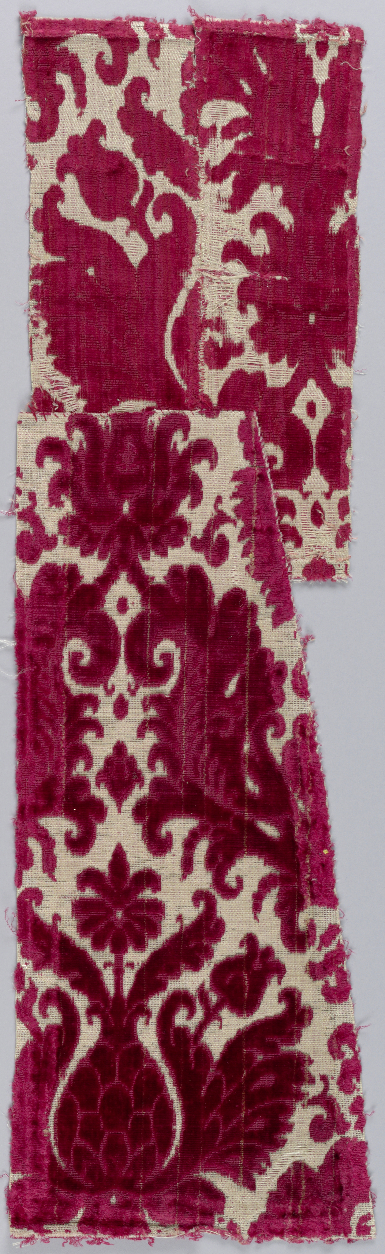 This is a Fragment. It is dated 17th century and we acquired it in 1953. Its medium is silk, metallic thread and its technique is velvet. It is a part of the Textiles department.