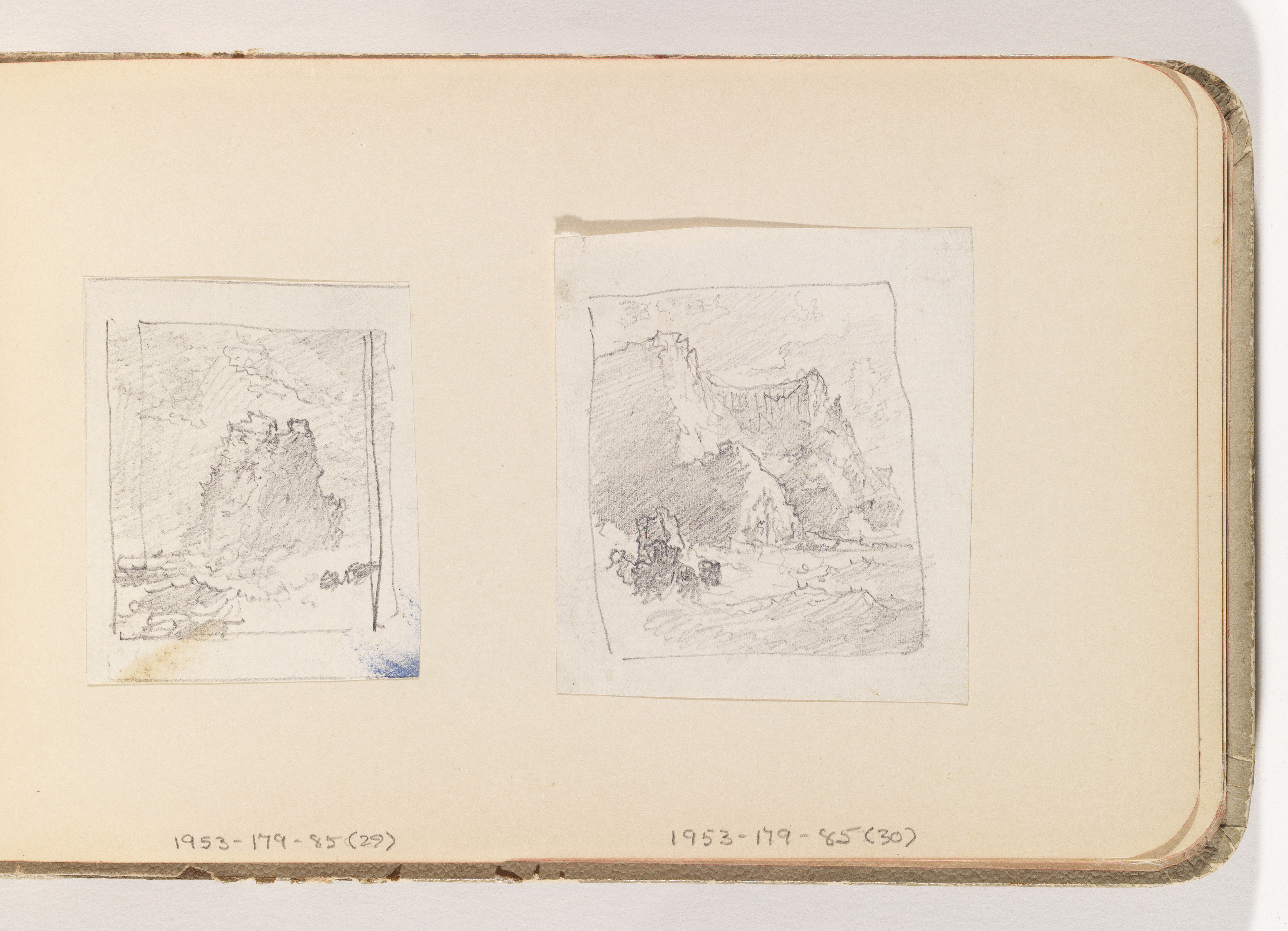 Album Page, Cliffs in Ocean; William Trost Richards (American, 1833–1905); USA; graphite on white paper, lined; 6 x 5 cm (2 3/8 x 1 15/16 in.), irregular; Gift of the National Academy of Design from the Mrs. William T. Brewster Bequest; 1953-179-85-29