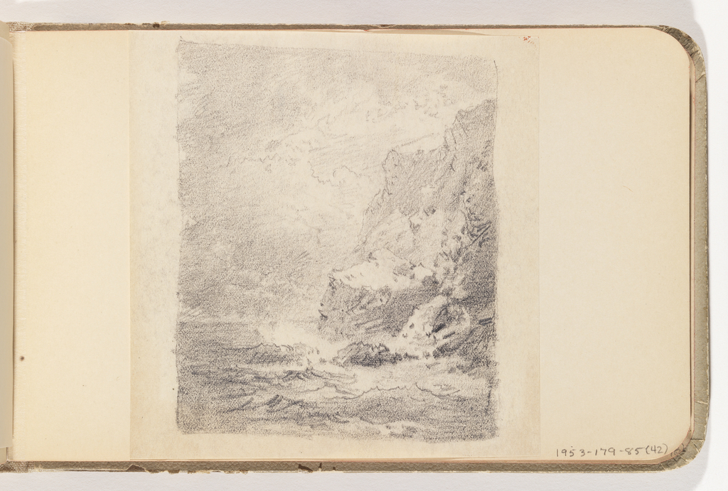 Album Page, Ocean Breaking against Tall Rocky Cliffside; William Trost Richards (American, 1833–1905); USA; graphite on off-white-colored textured paper, mounted; 12 x 11.3 cm (4 3/4 x 4 7/16 in.); Gift of the National Academy of Design from the Mrs. William T. Brewster Bequest; 1953-179-85-42