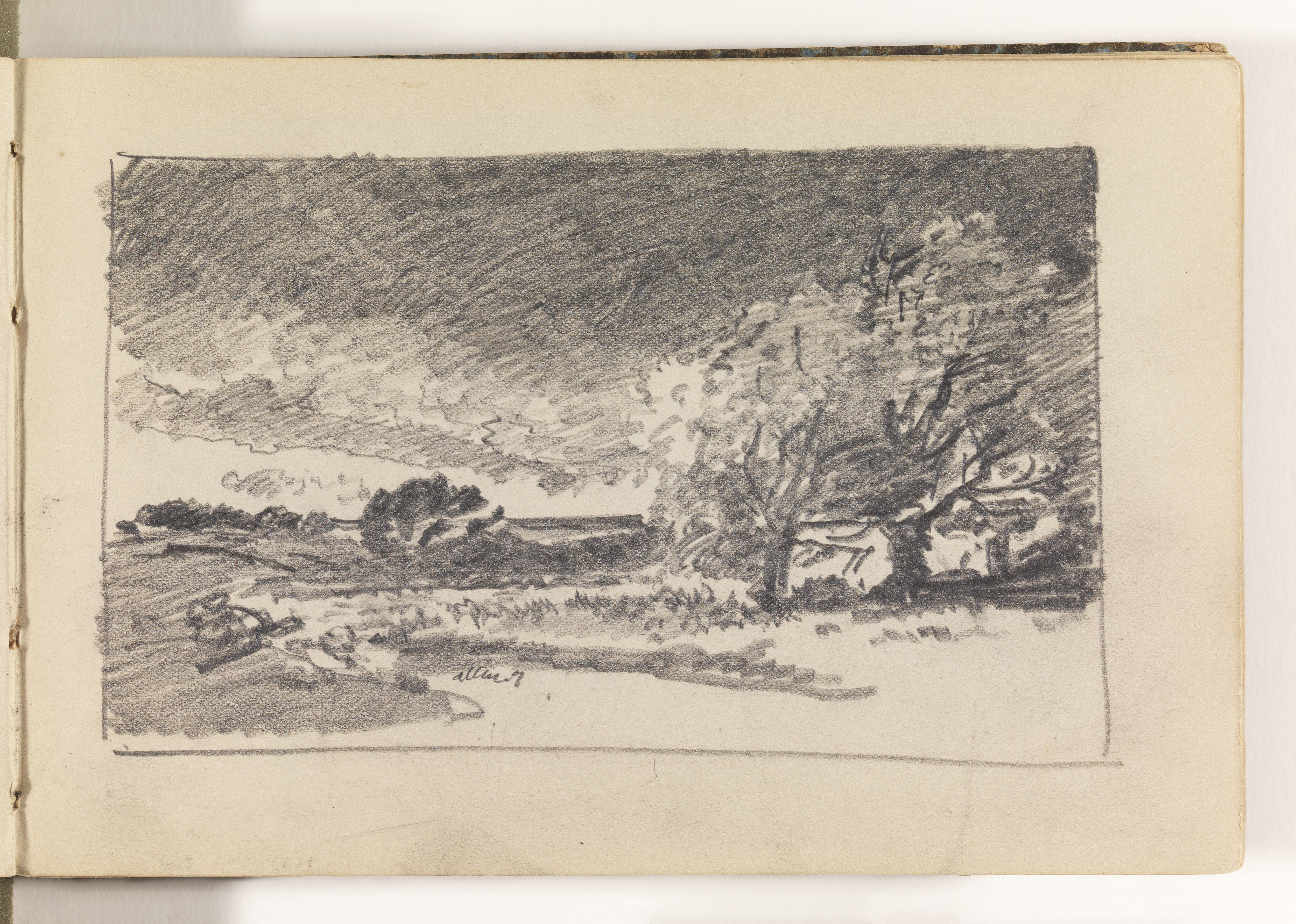 Sketchbook Folio, Countryside with Stream and Trees; William Trost Richards (American, 1833–1905); USA; graphite on cream wove paper, bound; 9.6 x 15.5 cm (3 3/4 x 6 1/8 in.) Sheet: 12.8 x 19.2 cm (5 1/16 x 7 9/16 in.); Gift of the National Academy of Design from the Mrs. William T. Brewster Bequest; 1953-179-86-7