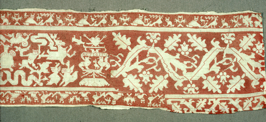 This is a Band. It is dated late 16th century and we acquired it in 1953. Its medium is linen on silk and its technique is cross-stitch embroidered on plain weave. It is a part of the Textiles department.
