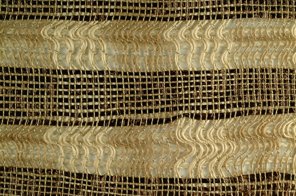 This is a Hand-woven sample. It was designed by Anni Albers and woven by Anni Albers. It is dated ca. 1949 and we acquired it in 1953. Its medium is jute, cotton, cellophane, horsehair and its technique is plain weave and gauze weave. It is a part of the Textiles department.