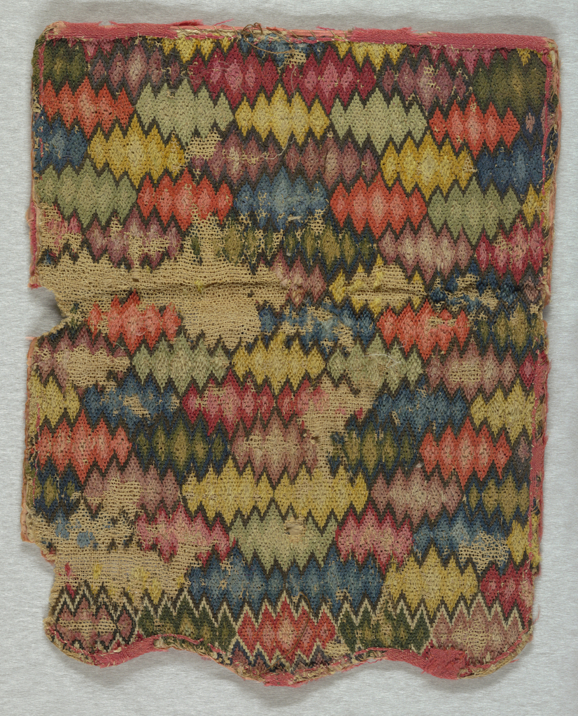 This is a Purse. It is dated 18th century and we acquired it in 1954. Its medium is wool, hemp and its technique is embroidered in counted flame stitch. It is a part of the Textiles department.