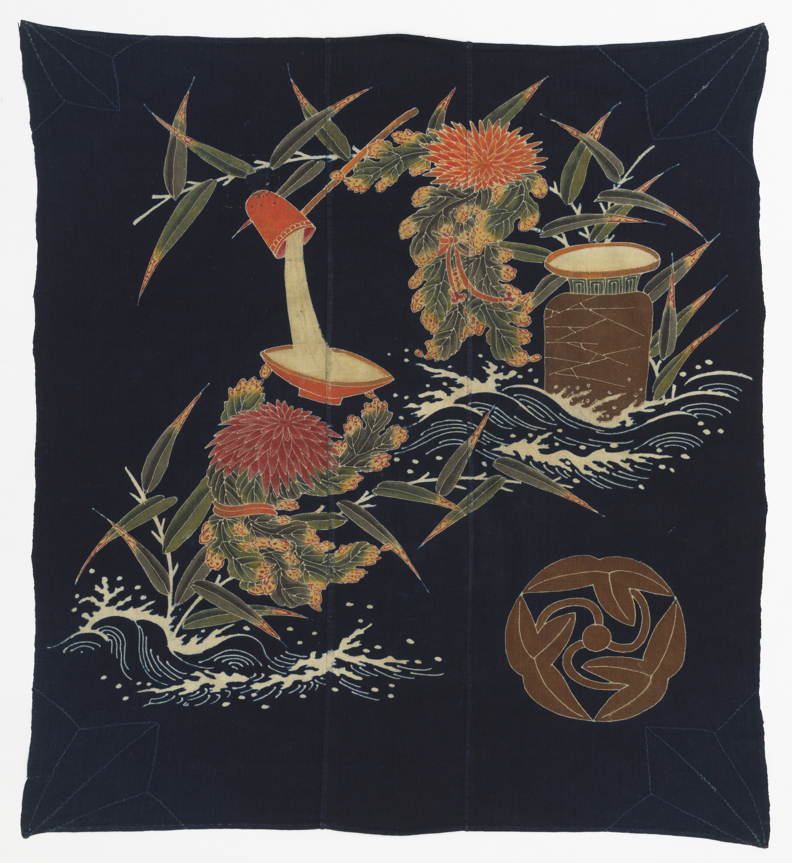 This is a Wrapping cloth (furoshiki). It is dated 19th century and we acquired it in 1954. Its medium is cotton and its technique is dyed, painted and stenciled, using resist outlining; plain weave foundation. It is a part of the Textiles department.