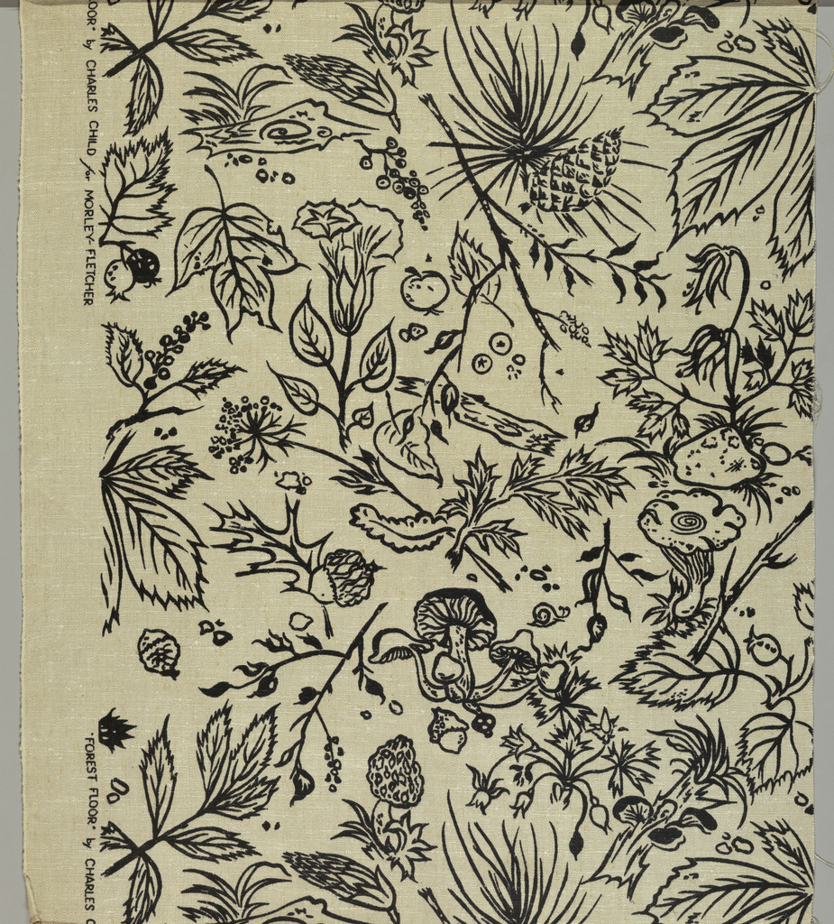 This is a Textile. It was designed by Charles Child and manufactured by Morley Fletcher Ltd., New York, NY. It is dated 1953 and we acquired it in 1954. Its medium is linen and its technique is silkscreen printed on plain weave. It is a part of the Textiles department.