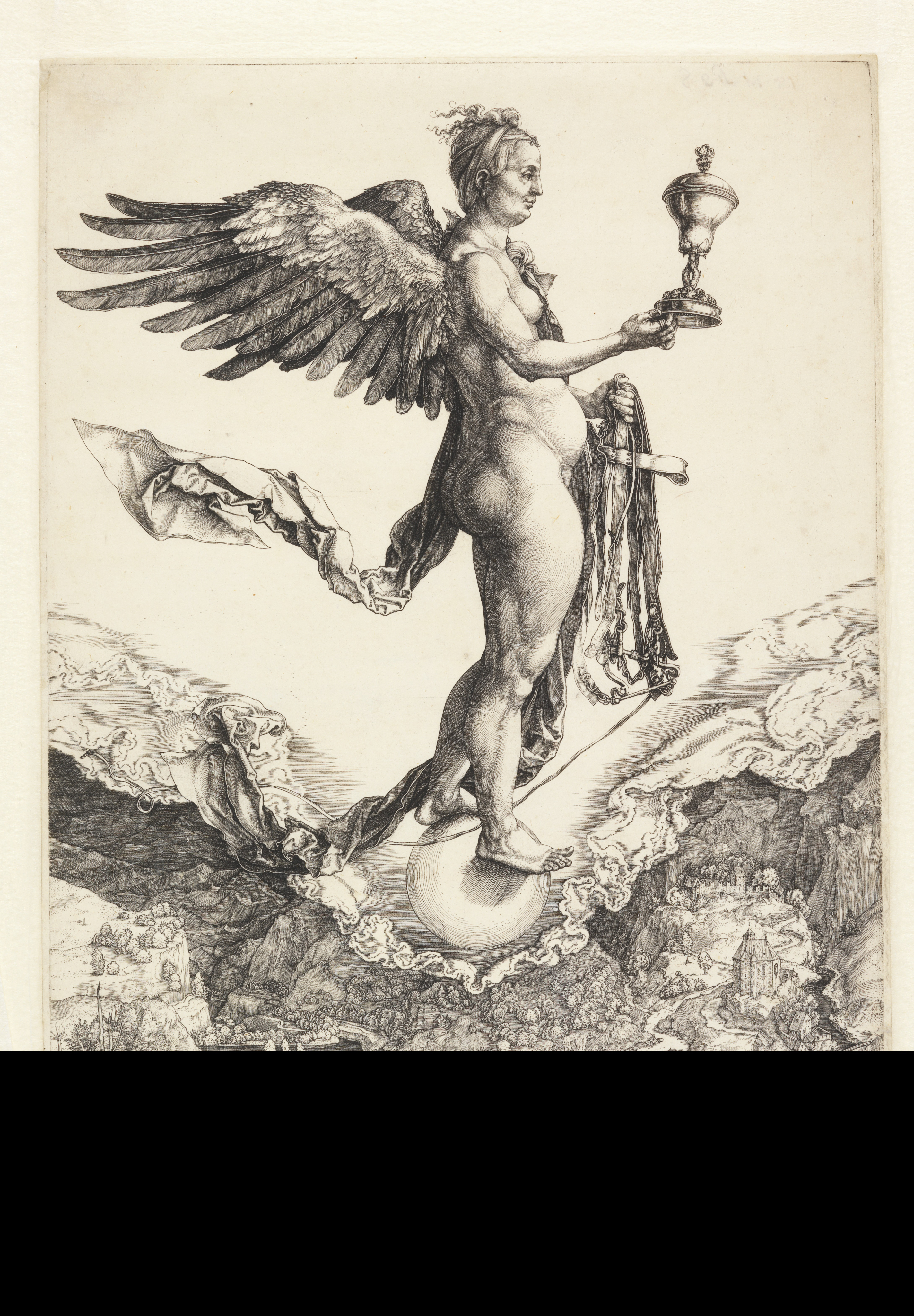 Print, Nemesis; Albrecht Dürer (German, 1471–1528); Germany; engraving on white laid paper; Overall: 33.5 x 23.3cm (13 3/16 x 9 3/16in.) Platemark: 33.2 x 22.9 cm (13 1/16 x 9 in.) Mat: 45.7 x 35.6 cm (18 x 14 in.); Gift of Leo Wallerstein; 1954-89-24
