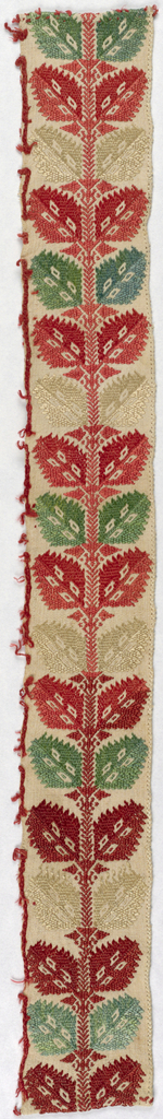 This is a Border. It is dated 18th century and we acquired it in 1955. Its medium is silk embroidery on linen foundation and its technique is embroidered in stem and darning stitches on plain weave. It is a part of the Textiles department.