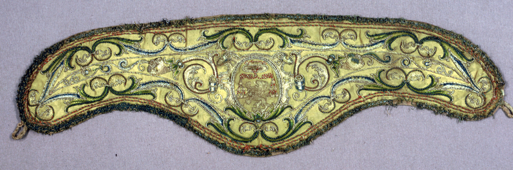 This is a Collar. It is dated 17th century and we acquired it in 1955. Its medium is silk, metal, linen and its technique is satin stitch embroidery, edged in couched gold cord. It is a part of the Textiles department.