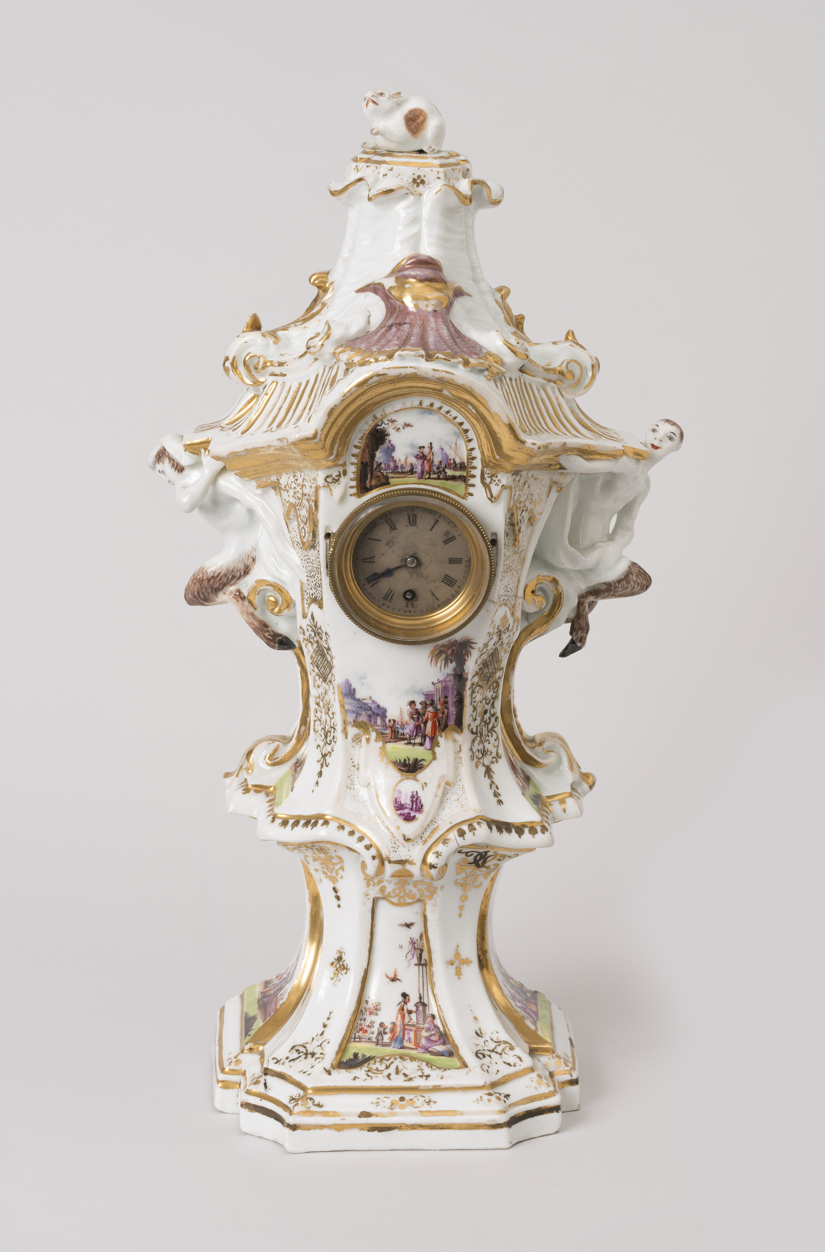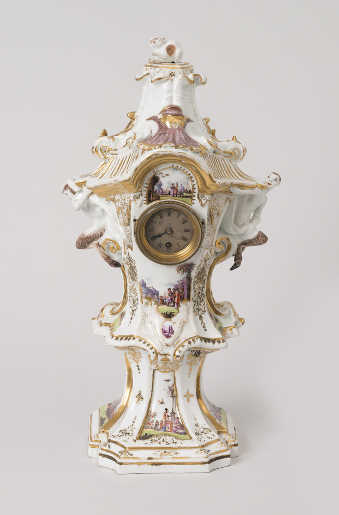 This is a clock. It was attributed to Johann Gottlob Kirchner and manufactured by Meissen Porcelain Manufactory. It is dated 1730–1733 and we acquired it in 1955. Its medium is hard paste porcelain, vitreous enamel, gold, metal. It is a part of the Product Design and Decorative Arts department.