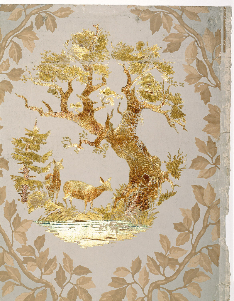 Sidewall (Germany); Manufactured by Einbeck Herting; block-printed, stamped foil, continuous paper; H x W: 56 x 49 cm (22 1/16 x 19 5/16 in.); Gift of Deutsches Tapetenmuseum; 1955-51-10