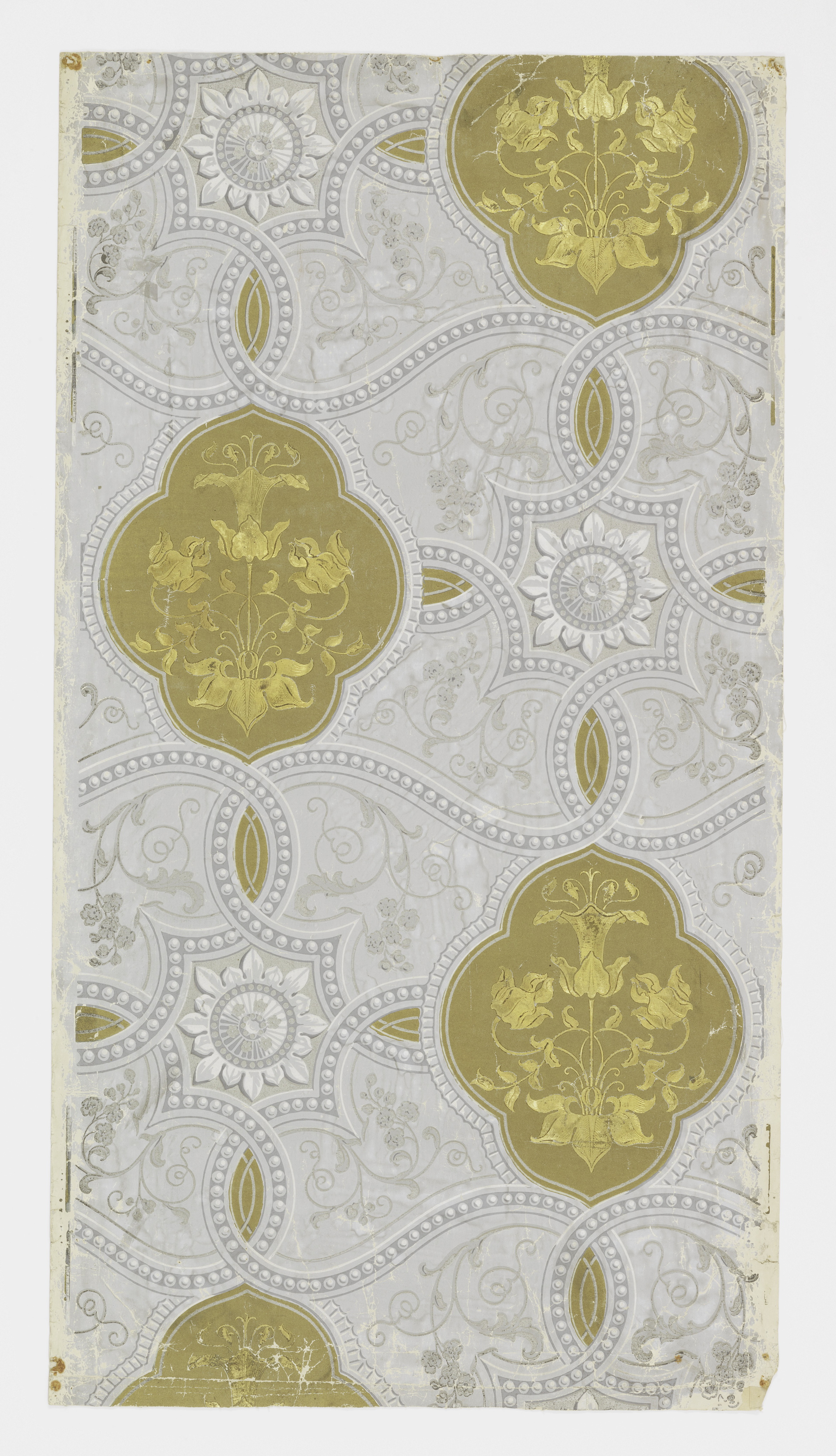 Sidewall (Germany); Manufactured by Carl Herting (German); block-printed, gold foil applique, silver; 90 x 48.5 cm (35 7/16 x 19 1/8 in.); Gift of Deutsches Tapetenmuseum; 1955-51-9