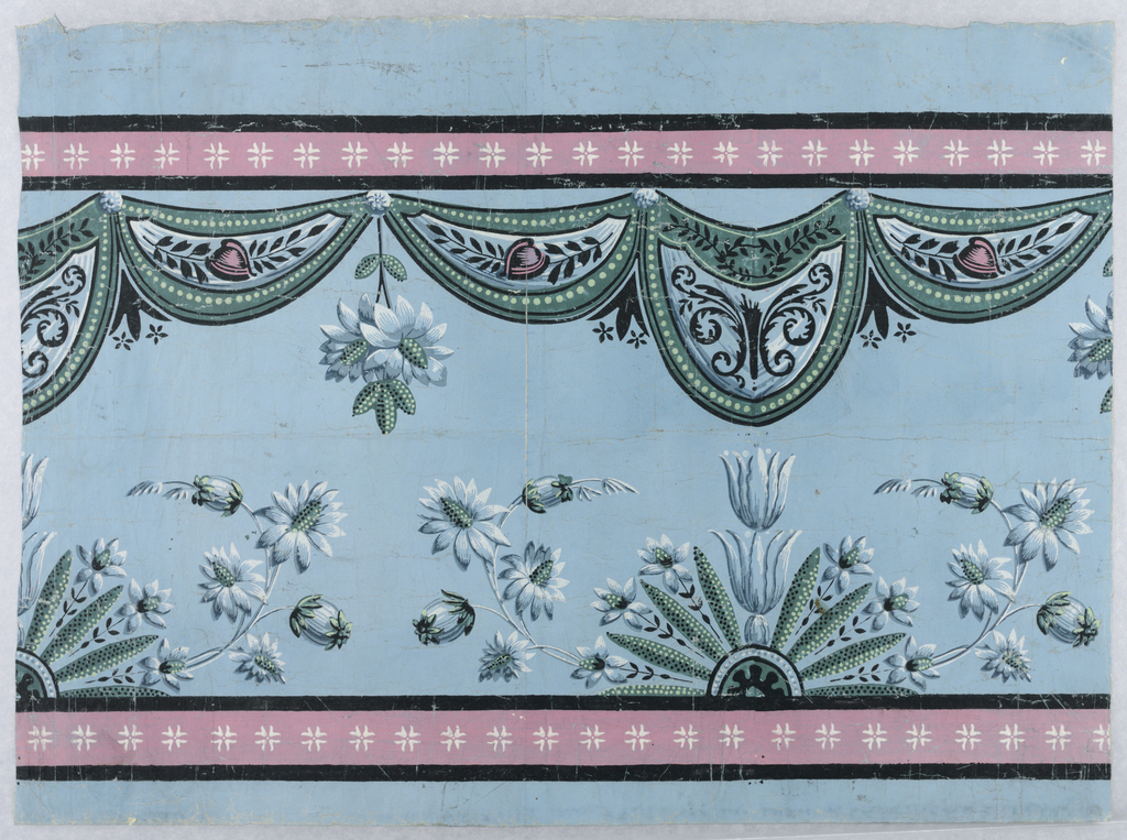 This is a frieze. It is dated 1795–1800 and we acquired it in 1955. Its medium is block-printed, handmade paper. It is a part of the Wallcoverings department.