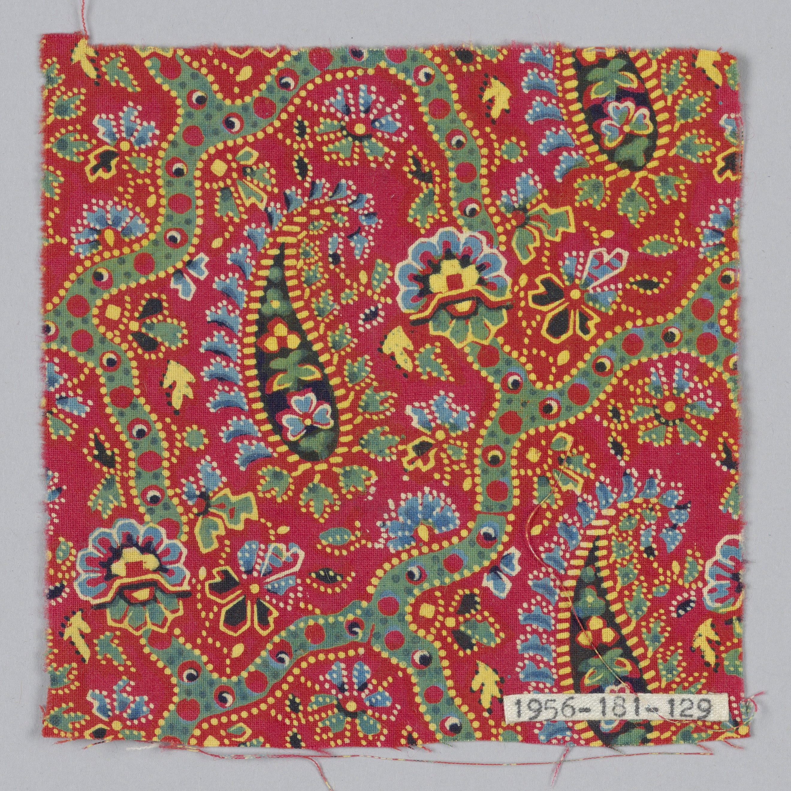 This is a Fragment. It is dated 19th century and we acquired it in 1956. Its medium is cotton and its technique is printed on plain weave. It is a part of the Textiles department.