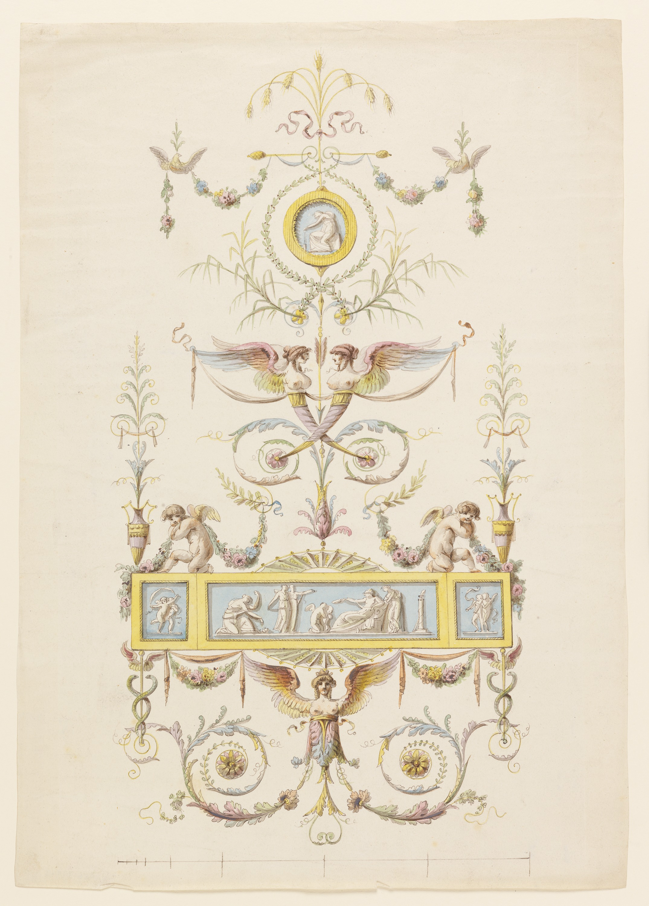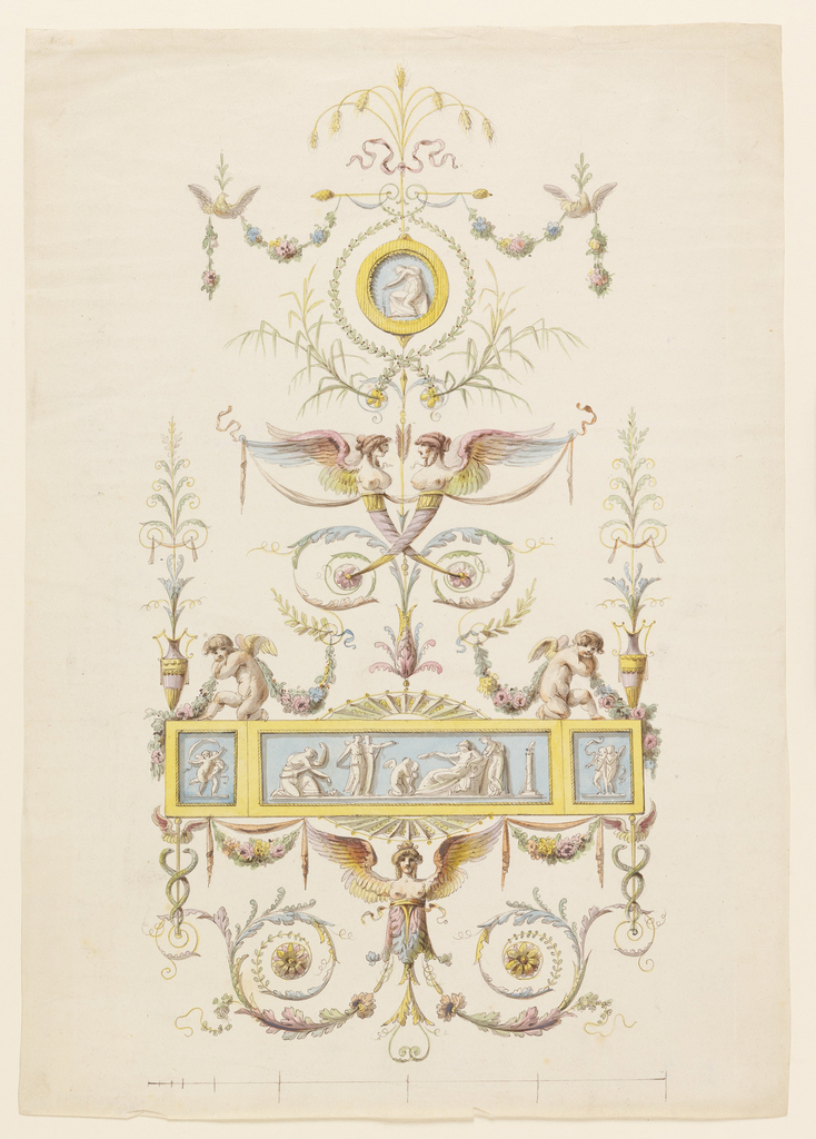 Drawing, Design for a painted panel; Collaborator: Robert Adam (British, 1728–1792); Style of Michel Angelo Pergolesi (Italian, active ca. 1760–1801); Italy; pen and ink with watercolor washes on paper; 42 × 29.5 cm (16 9/16 × 11 5/8 in.); 1956-199-3