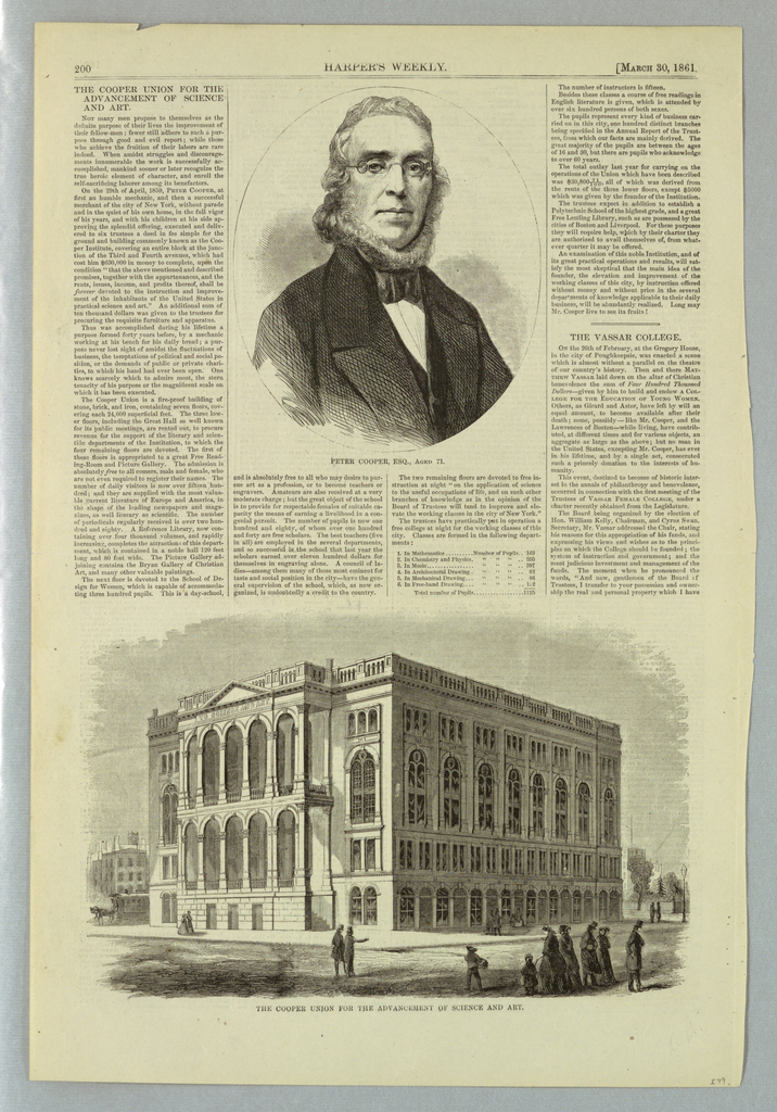 This is a Print. It was published by Harper's Weekly and subject: Peter Cooper and Cooper Union. It is dated March 30, 1861 and we acquired it in 1956. It is a part of the Drawings, Prints, and Graphic Design department.