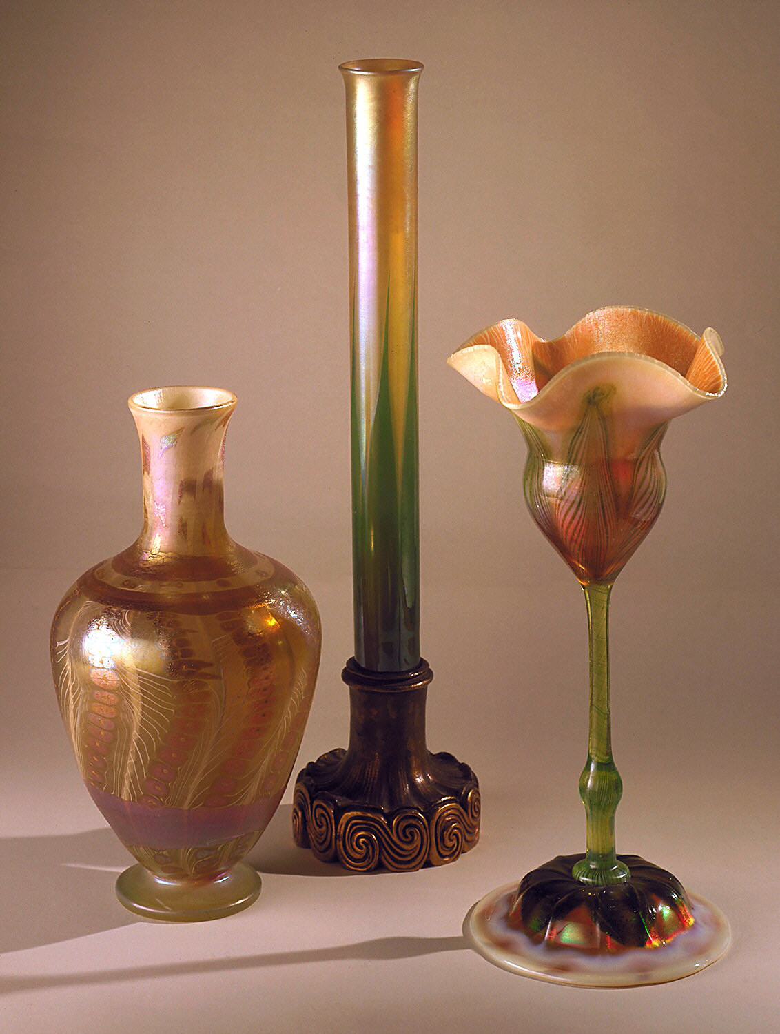 This is a Vase. It was overseen (as design director) by Louis Comfort and produced by Tiffany Glass and Decorating Company and manufactured by Tiffany Studios. It is dated ca. 1906 and we acquired it in 1956. Its medium is favrile glass. It is a part of the Product Design and Decorative Arts department.