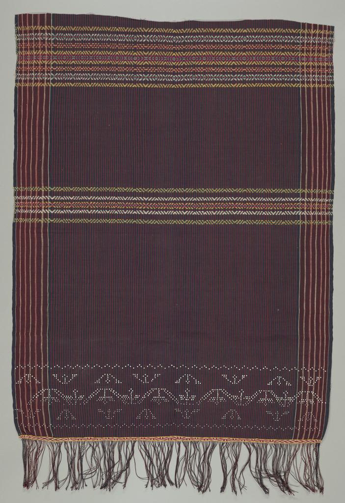 This is a Sarong or shoulder cloth (selendang) end. It is dated early 20th century and we acquired it in 1956. Its medium is bast fiber, glass beads and its technique is plain weave with groups of lance beads; plaited and twisted warp fringe. It is a part of the Textiles department.