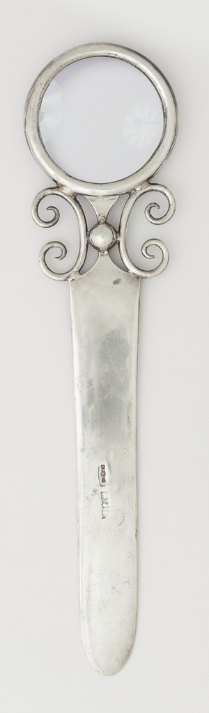 This is a letter opener, magnifying glass. It was manufactured by Barrett and Sons and Barrett and Sons. It is dated ca. 1910 and we acquired it in 1957. Its medium is silver, silver plated, metal, glass. It is a part of the Product Design and Decorative Arts department.