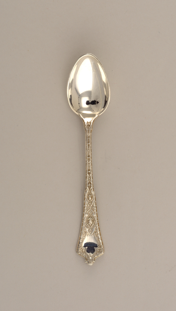This is a spoons. It was designed by Edward C. Moore (1827-1891) and made by Tiffany and Co. and manufactured by Tiffany and Co. and retailed by Tiffany and Co.. It is dated patent 1872, produced 1872-1875 and we acquired it in 1957. Its medium is silver. It is a part of the Product Design and Decorative Arts department.